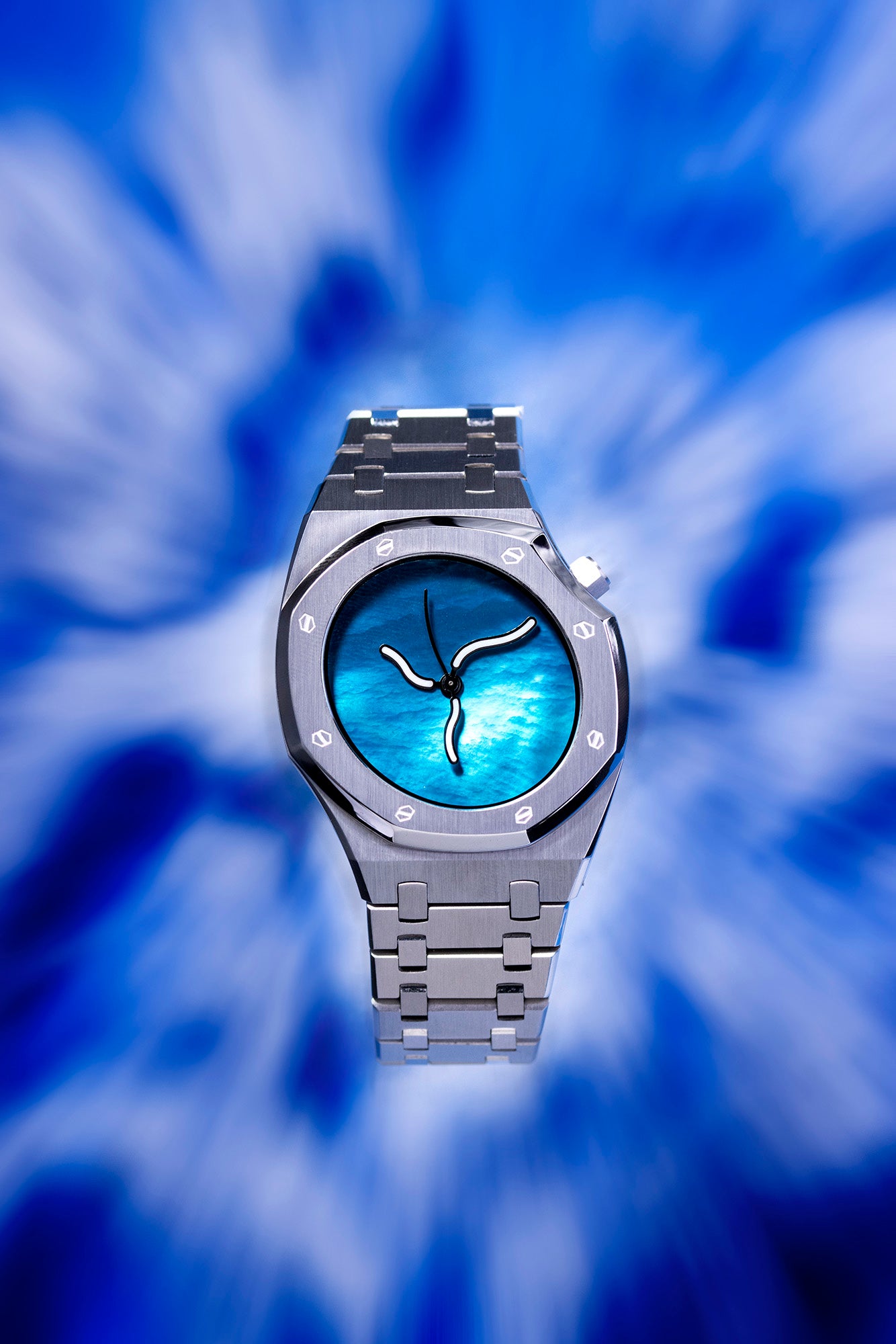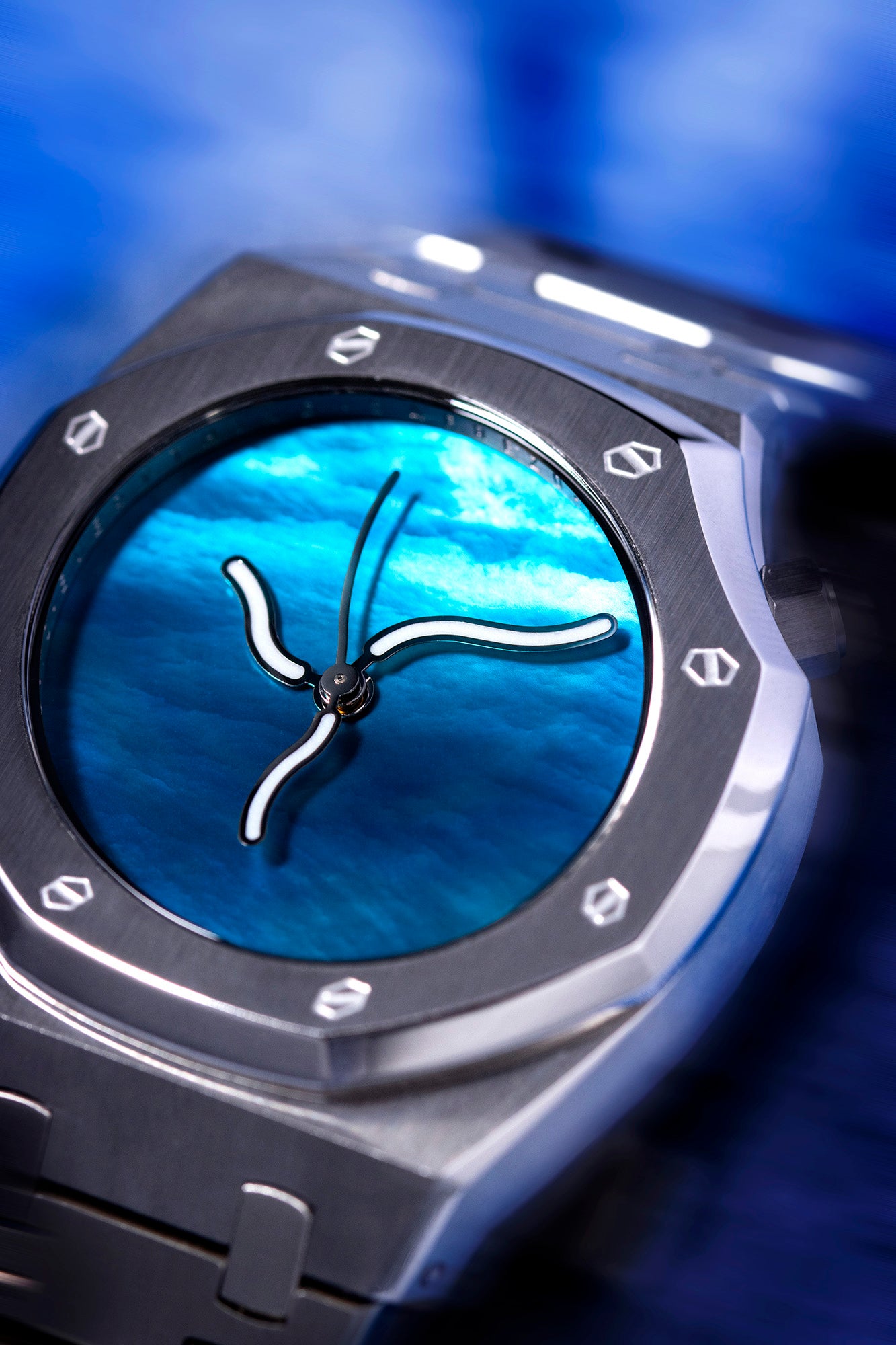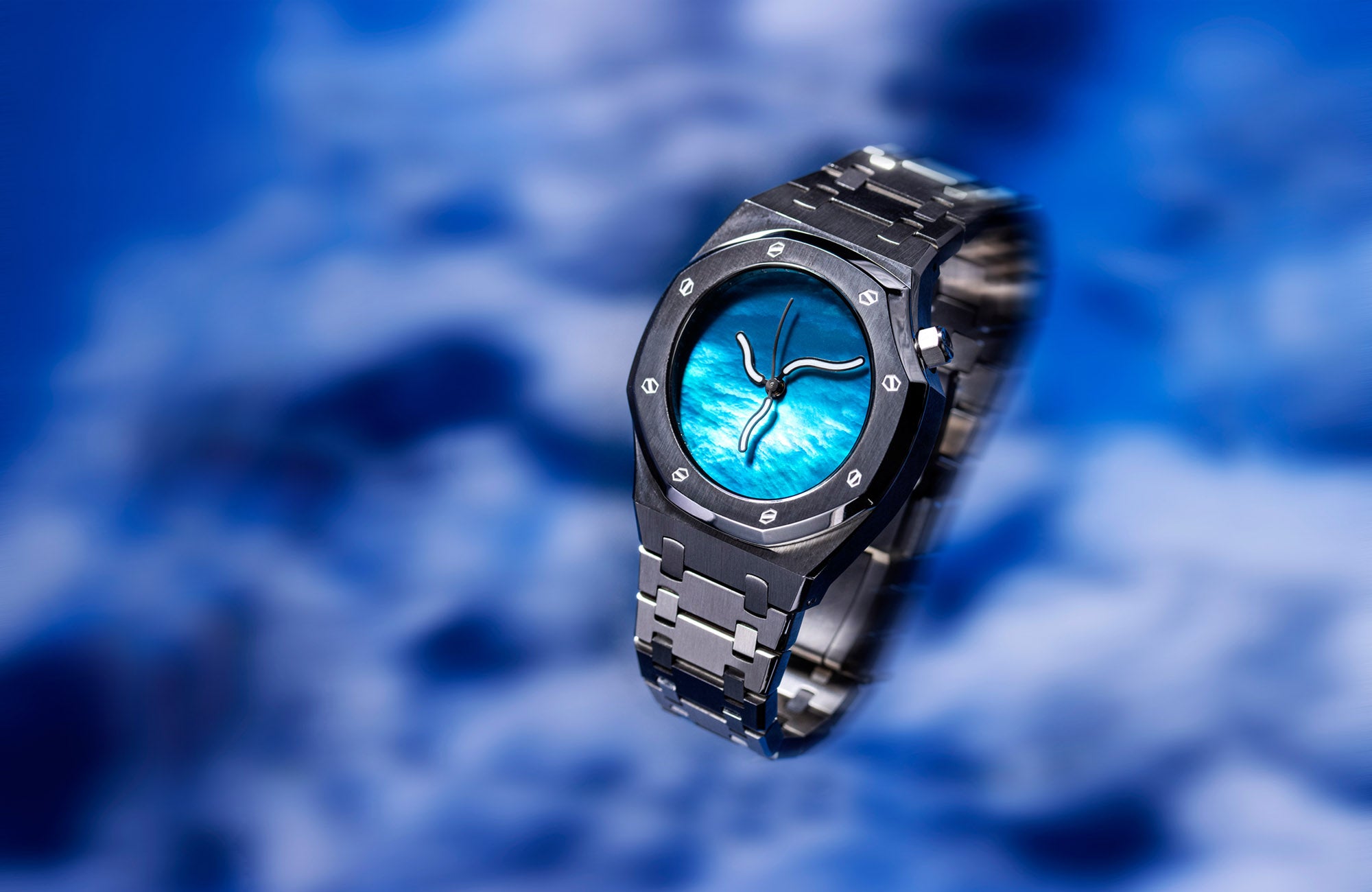 这款腕表表盘的设计理念融合了大自然元素与中国传统元素,表盘由天然珍珠母贝雕琢而成,因其独特的光泽而呈现出细腻梦幻的蓝色珠光色调。承袭了Safrezo一贯的设计美学,在光线的照耀下,表盘的蓝色调会折射深邃迷人的卷云纹路,仿若一幅浑然天成的“卷云”画卷。