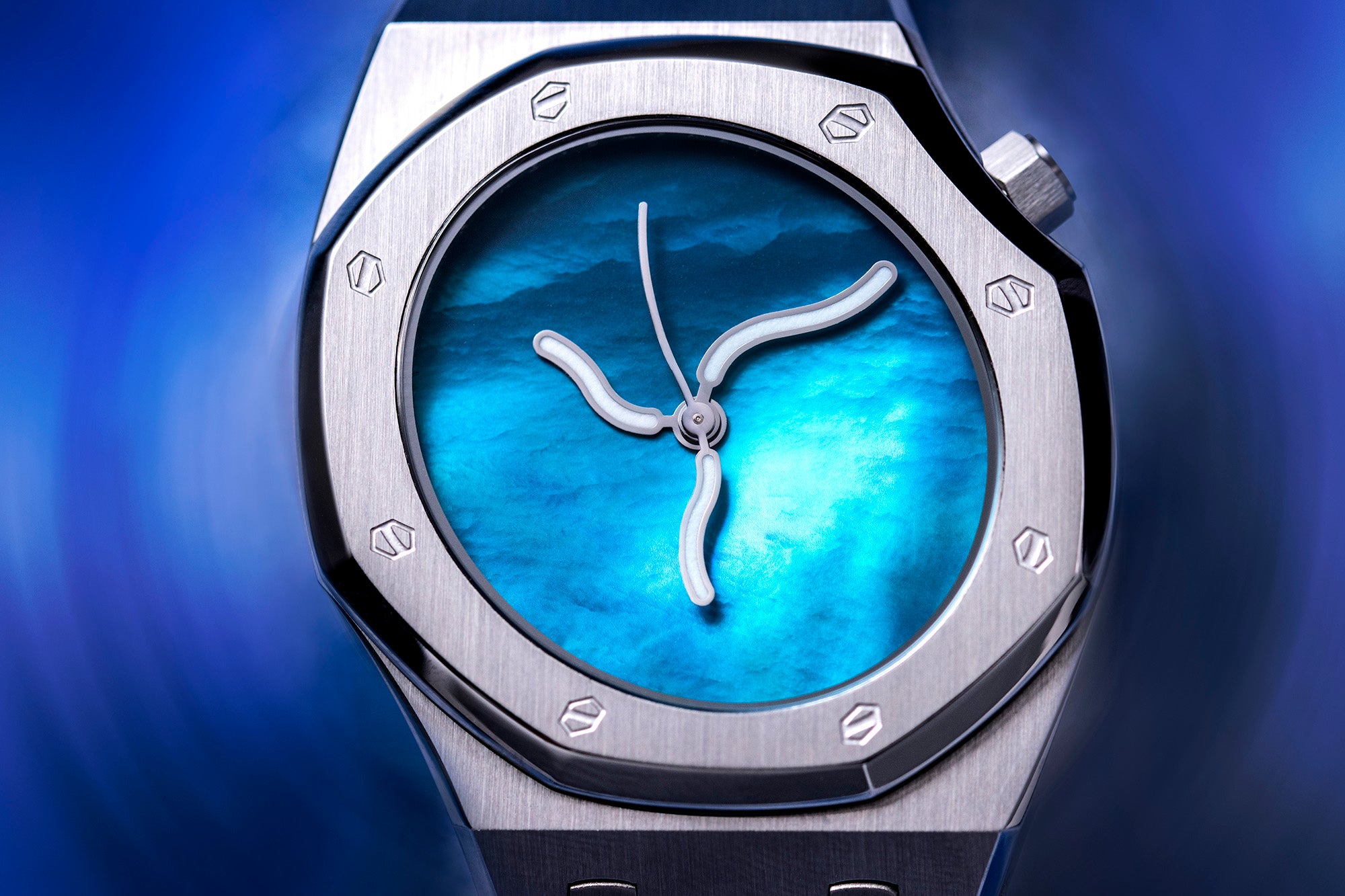 “曲线橡树”的设计灵感源自自然的流动性与人类美学的动态律动。S形曲线在自然界中广泛存在(例如河流、藤蔓和人体脊柱),具有柔和、优雅、充满张力的美感。Safrezo创新地将S形扭曲的金属表链、表盘和指针融为一体,形成一个整体结构。将这种流动的曲线融入腕表设计,赋予腕表生命力和艺术感,传达“时间如水,流转不止”的哲学理念。