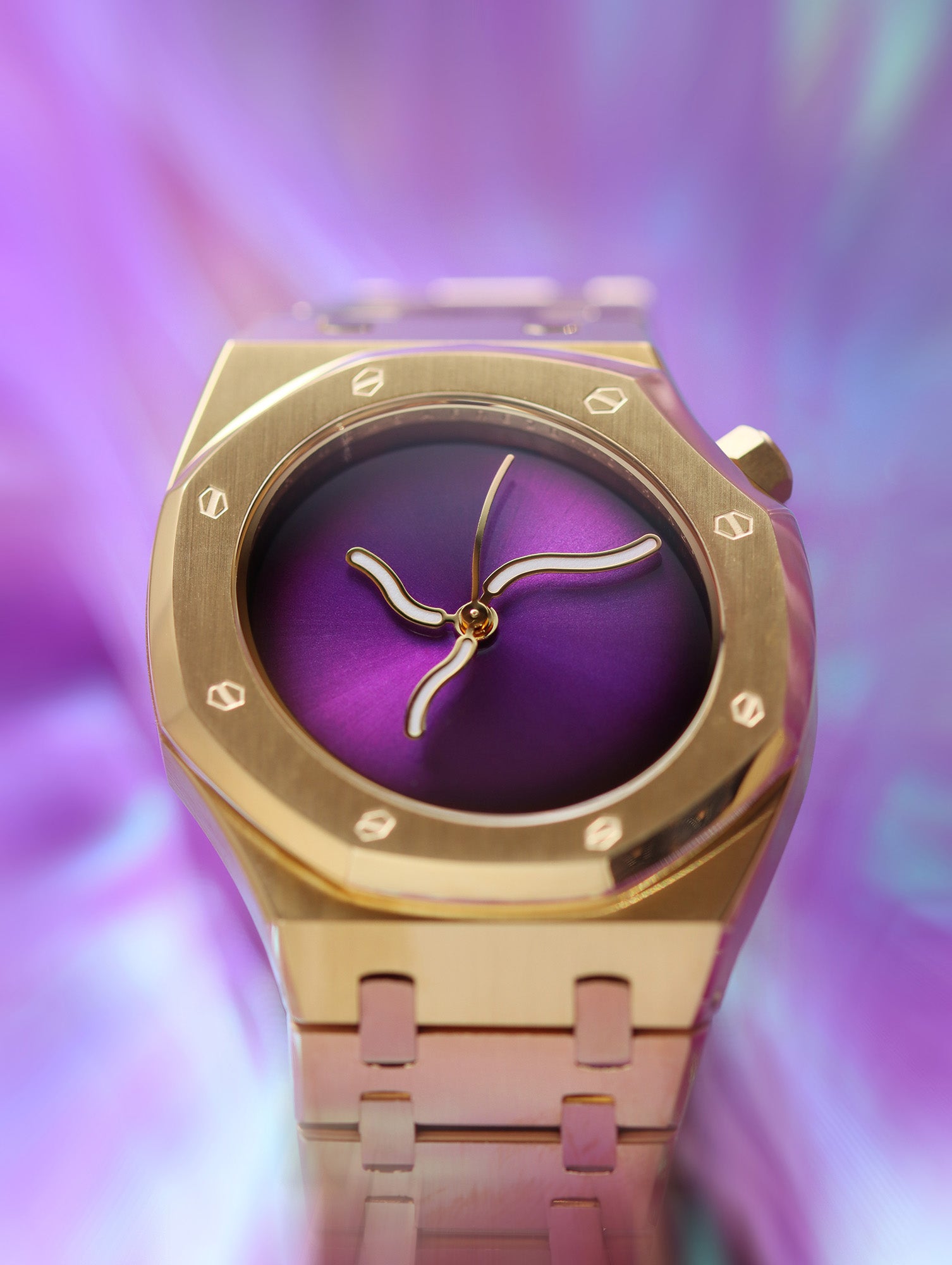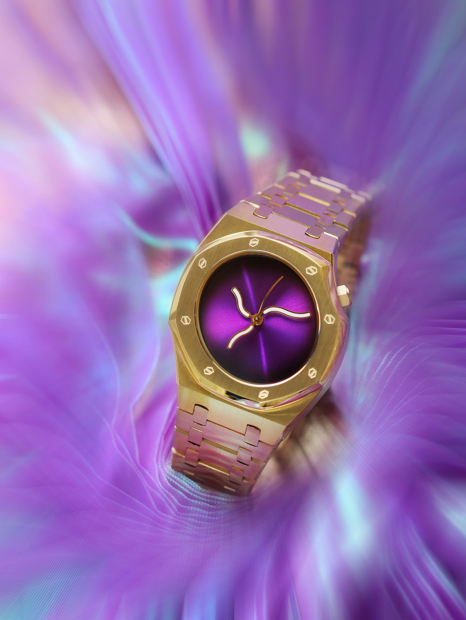 “曲线橡树” 的设计灵感源于自然界的流动性与人体美学的动态韵律,S型曲线作为自然界中广泛存在的形态( 如河流、藤蔓、人体脊柱),具有柔和、优雅且充满张力的美感。Safrezo破天荒地将S型扭曲金属表链、表盘与指针融为一体,通过将这种流动的曲线融入腕表结构,赋予时间载体以生命感和艺术性,传递“时间如水,流动不息”的哲学理念。