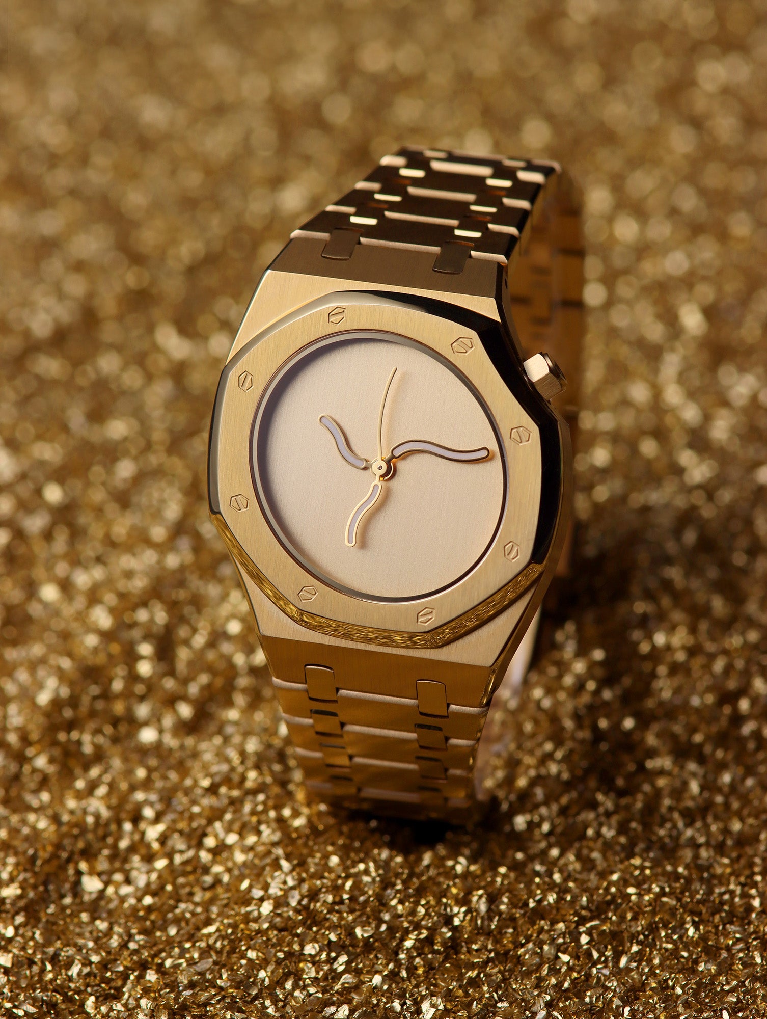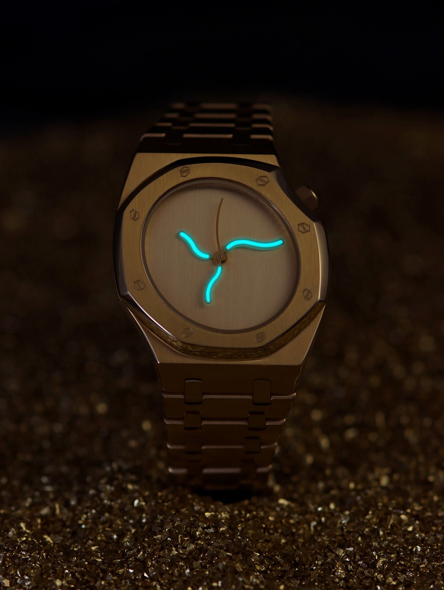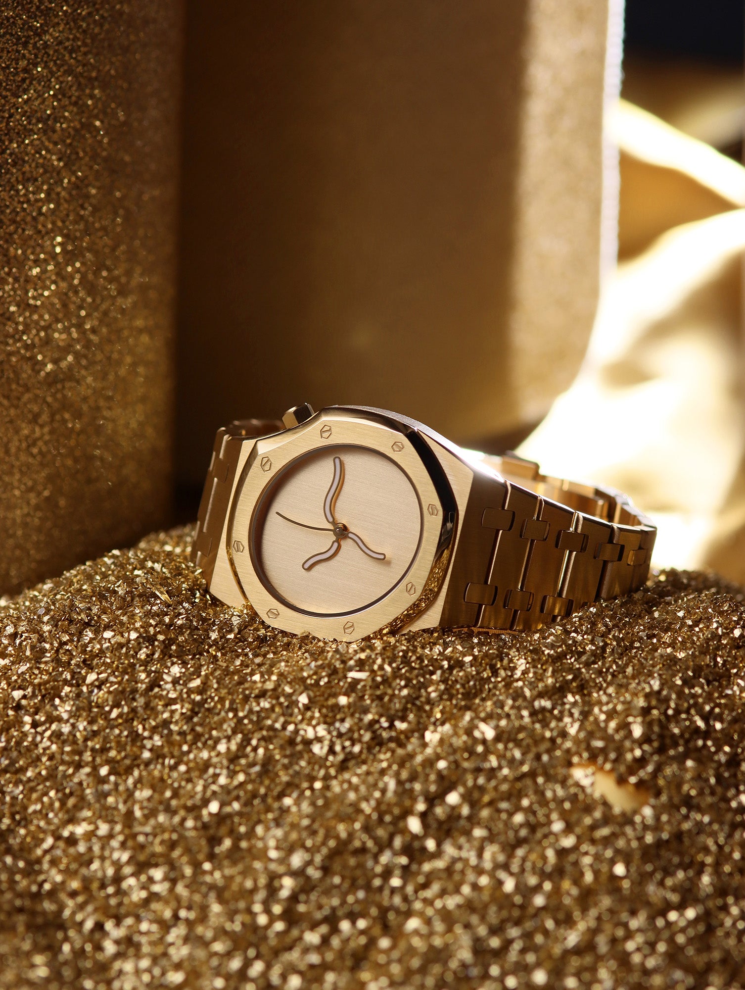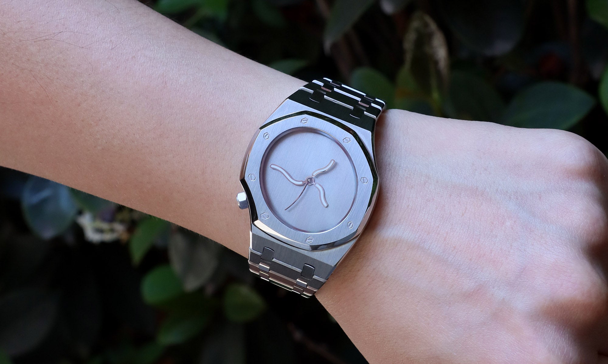 “曲线橡树” 的设计灵感源于自然界的流动性与人体美学的动态韵律,S型曲线作为自然界中广泛存在的形态( 如河流、藤蔓、人体脊柱),具有柔和、优雅且充满张力的美感。Safrezo破天荒地将S型扭曲金属表链、表盘与指针融为一体,通过将这种流动的曲线融入腕表结构,赋予时间载体以生命感和艺术性,传递“时间如水,流动不息”的哲学理念。