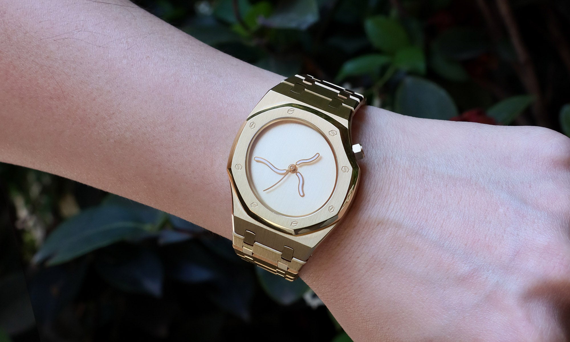 “曲线橡树” 的设计灵感源于自然界的流动性与人体美学的动态韵律,S型曲线作为自然界中广泛存在的形态( 如河流、藤蔓、人体脊柱),具有柔和、优雅且充满张力的美感。Safrezo破天荒地将S型扭曲金属表链、表盘与指针融为一体,通过将这种流动的曲线融入腕表结构,赋予时间载体以生命感和艺术性,传递“时间如水,流动不息”的哲学理念。