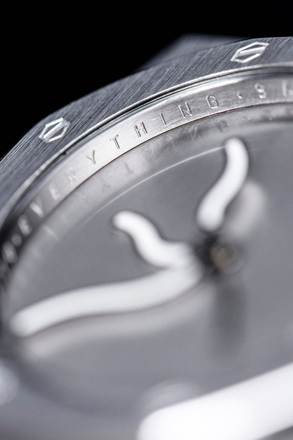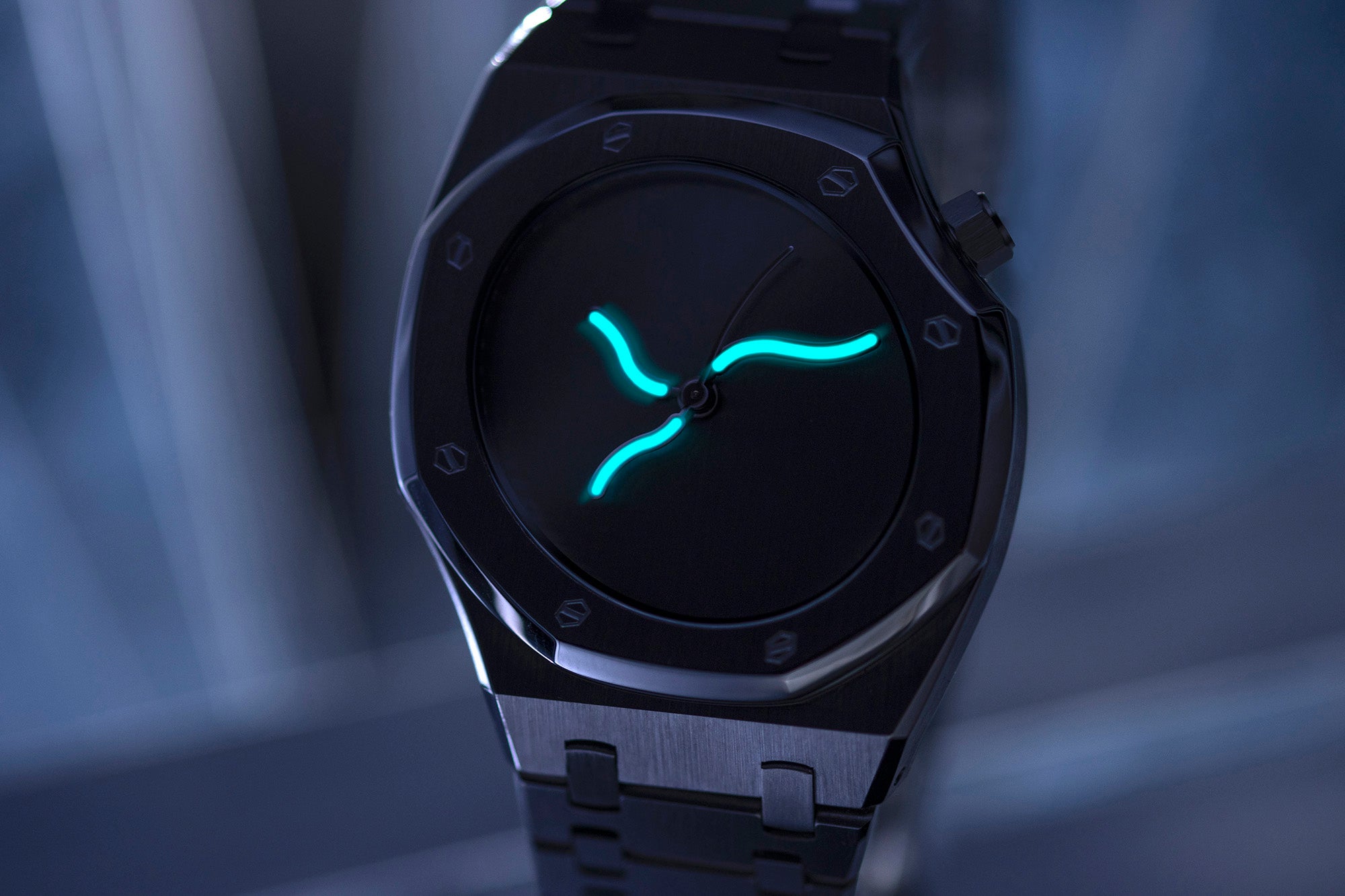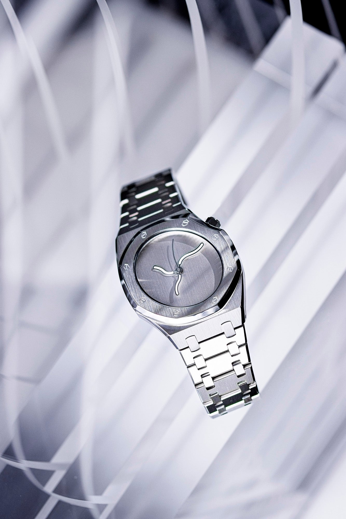 “曲线橡树” 的设计灵感源于自然界的流动性与人体美学的动态韵律,S型曲线作为自然界中广泛存在的形态( 如河流、藤蔓、人体脊柱),具有柔和、优雅且充满张力的美感。Safrezo破天荒地将S型扭曲金属表链、表盘与指针融为一体,通过将这种流动的曲线融入腕表结构,赋予时间载体以生命感和艺术性,传递“时间如水,流动不息”的哲学理念。