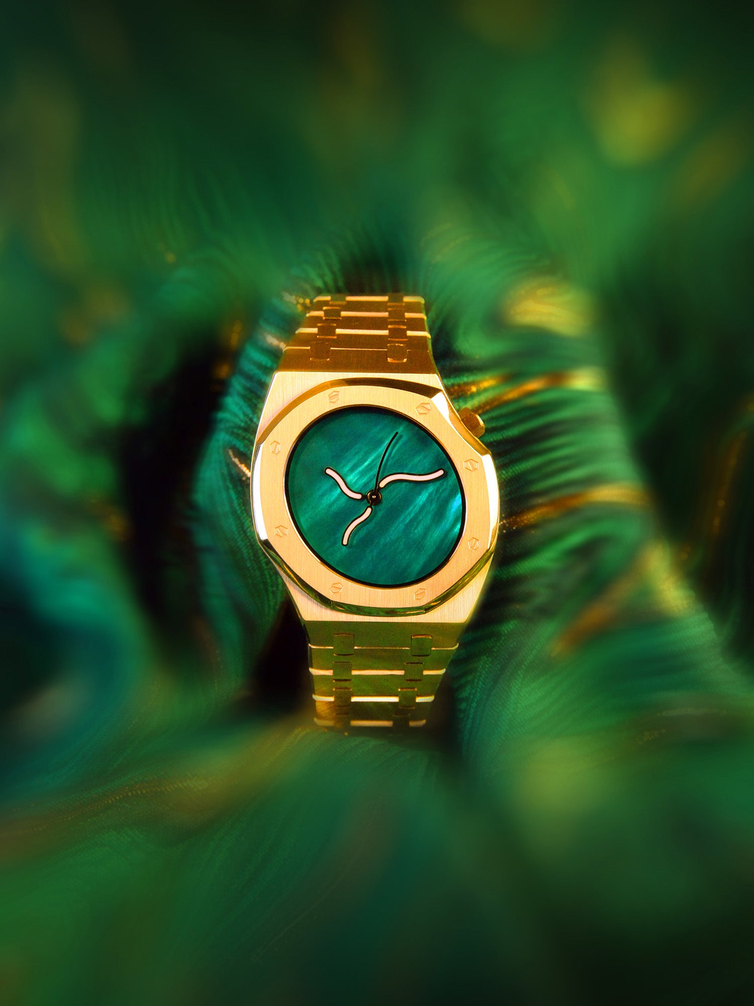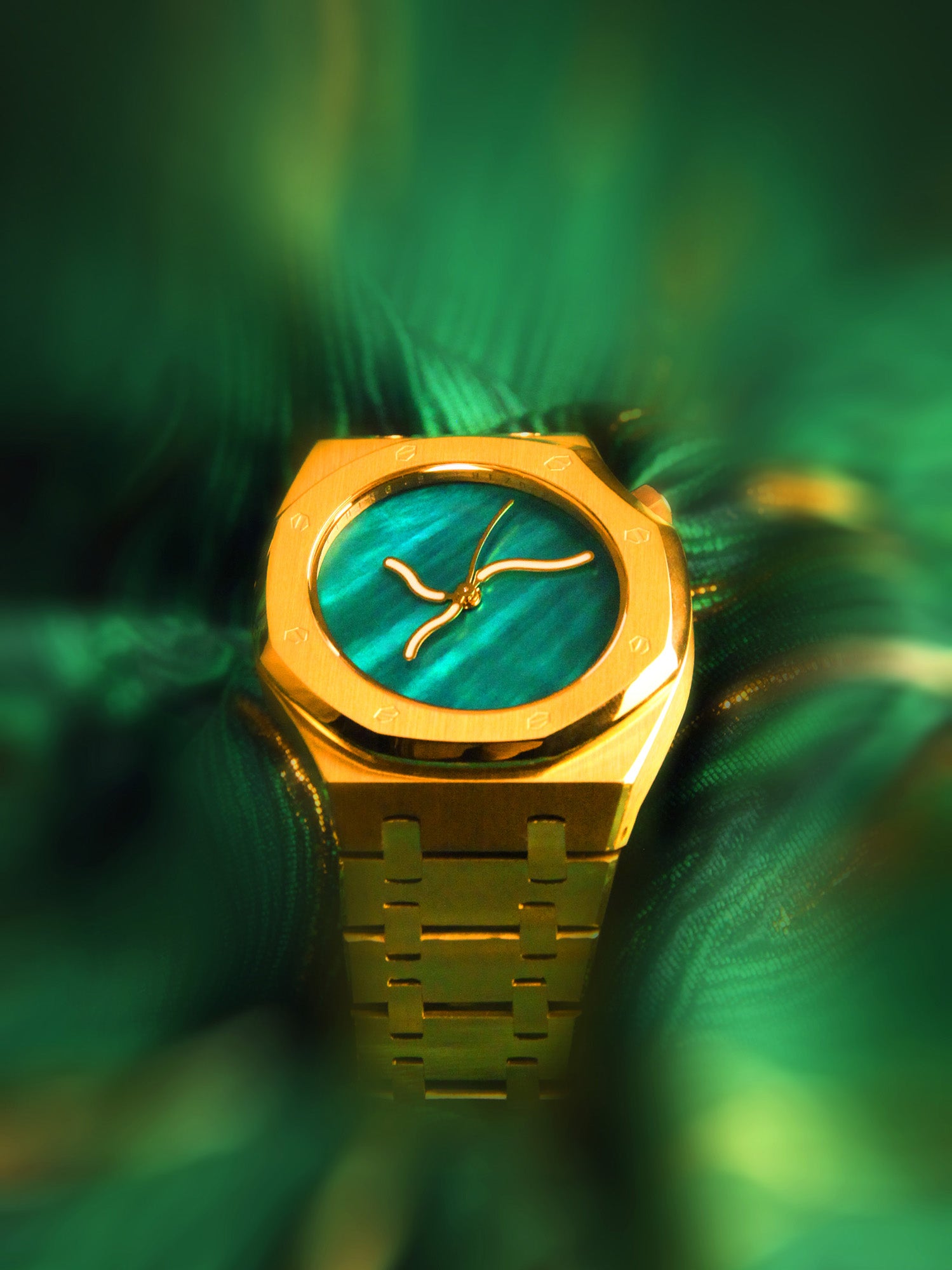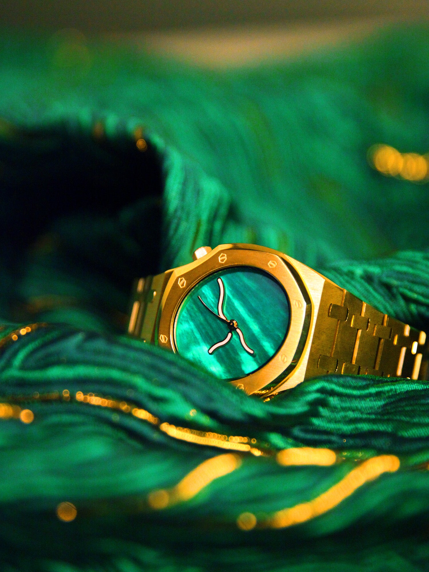 表盘灵感源自湖面荡漾的流波光斑,选用天然贝母材质,呈现如湖面般深邃灵动的渐变光泽。光线流转间,色彩在翠绿与黛青之间微妙过渡,仿若阳光穿透湖水时折射出的粼粼波影,凝萃自然一瞬的流光,化为时光诗篇。