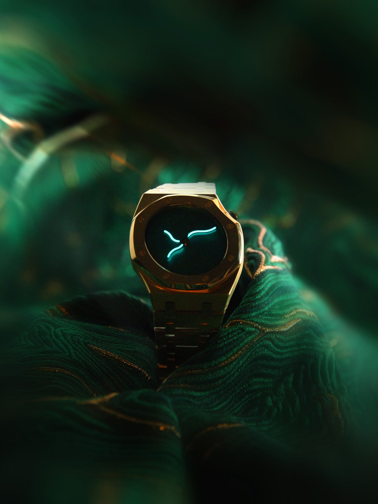 “曲线橡树”的设计灵感源自自然的流动性与人类美学的动态律动。S形曲线在自然界中广泛存在(例如河流、藤蔓和人体脊柱),具有柔和、优雅、充满张力的美感。Safrezo创新地将S形扭曲的金属表链、表盘和指针融为一体,形成一个整体结构。将这种流动的曲线融入腕表设计,赋予腕表生命力和艺术感,传达“时间如水,流转不止”的哲学理念。